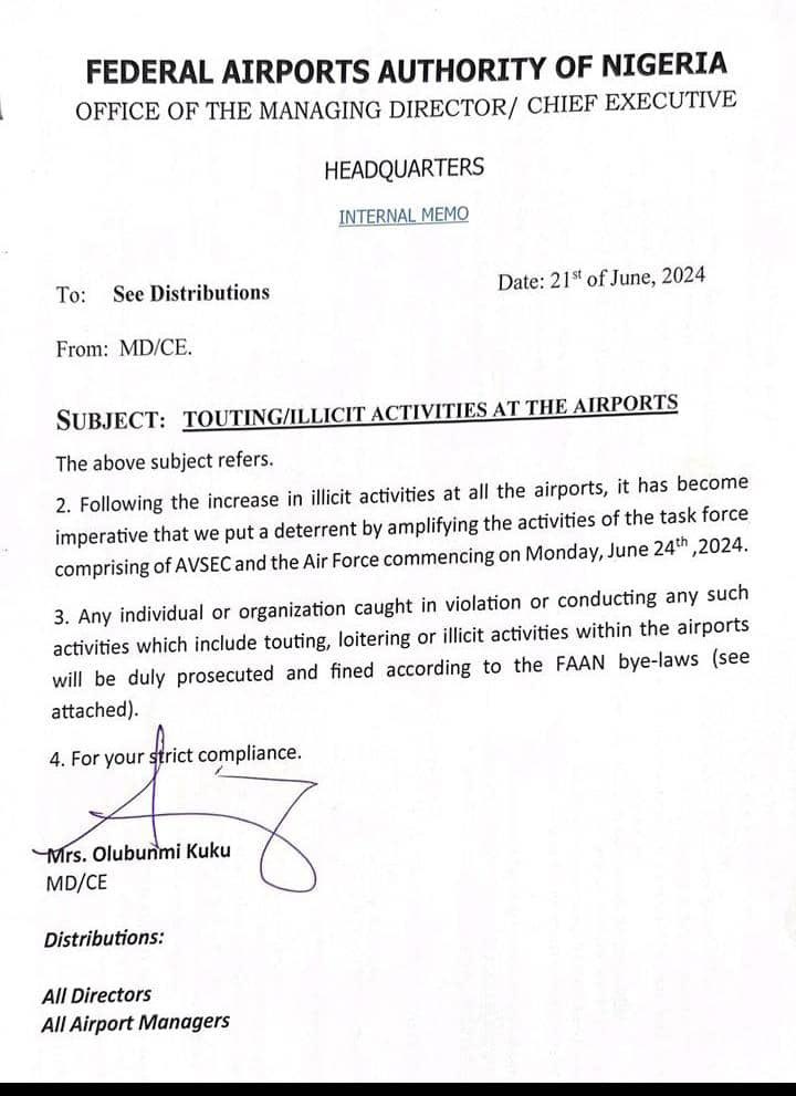 Kuku who declared her intention to personally engage with all government agencies operating at the airports to ensure compliance with the anti-touting and anti-extortion measures, stressed the commitment of FAAN under her management to deliver exceptional service and ensuring a safe and secure environment for all passengers and airport users.