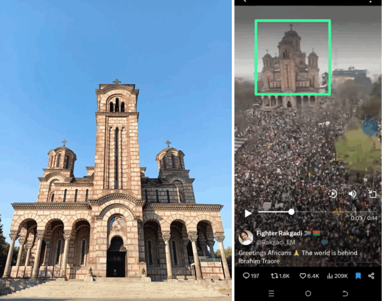 Image showing the Saint Mark Orthodox Church in Belgrade (left) and the screenshot from the viral video