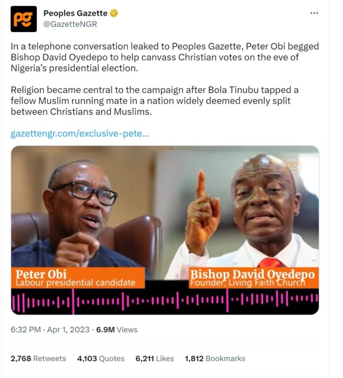 Claim: In a leaked private phone conversation published by Peoples Gazette, an alleged voice of Peter Obi, the Presidential candidate of the Labour Party (LP) in the 2023 general election could be heard begging Bishop David Oyedepo, the founder of the Living Faith Church Worldwide, to help canvass Christian votes on the eve of Nigeria’s presidential election, describing it as a “religious war.”