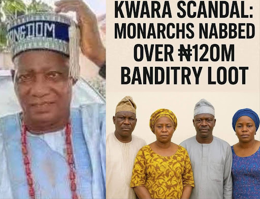 An infographic showing four individuals in traditional attire accompanied the caption: “Kwara Scandal: Monarchs Nabbed Over N120m Banditry Loot.” According to the post, N90 million was recovered from the King of Alabe’s palace, while N30 million was traced to his Queen’s account.