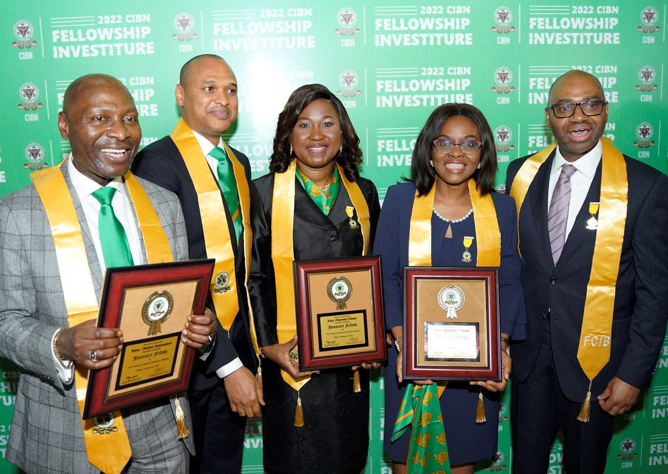 Managing Director, Parallex Bank, Mr. Femi Bakre; Founder/Managing Director, TajBank, Mr. Hamid Joda; Managing Director, First City Monument Bank (FCMB), Mrs. Yemisi Edun; Managing Director, FSDH Merchant Bank, Mrs. Bukola Smith and Managing Director, Greenwich Merchant Bank, Mr. Bayo Rotimi, during the Investiture of Mrs. Edun and the others as Honorary Fellows of the Chartered Institute of Bankers of Nigeria (CIBN) on October 29, 2022 in Lagos.