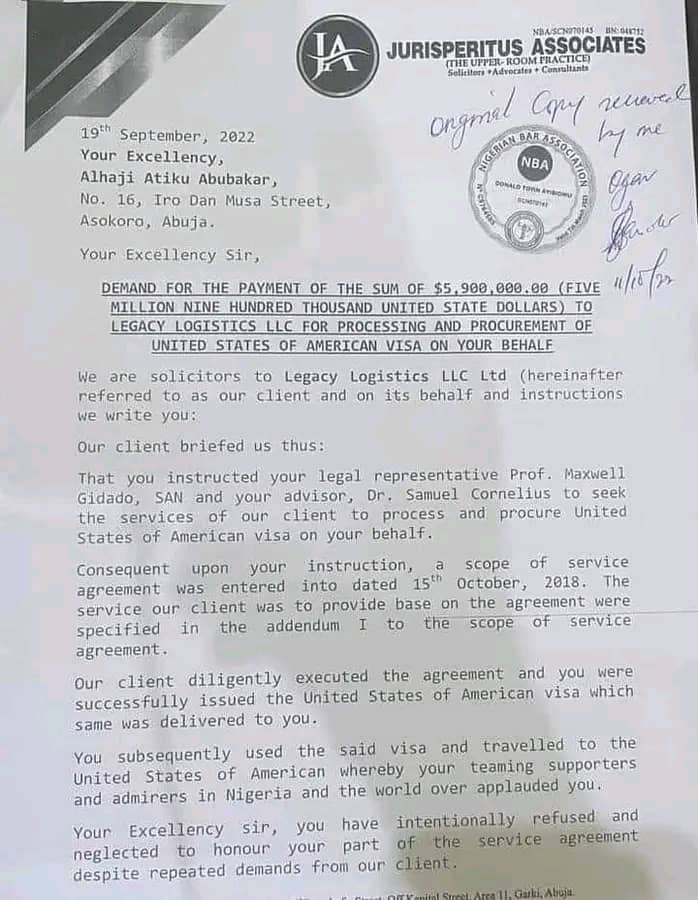 The firm alleges that Atiku was yet to pay the princely sum for the visa