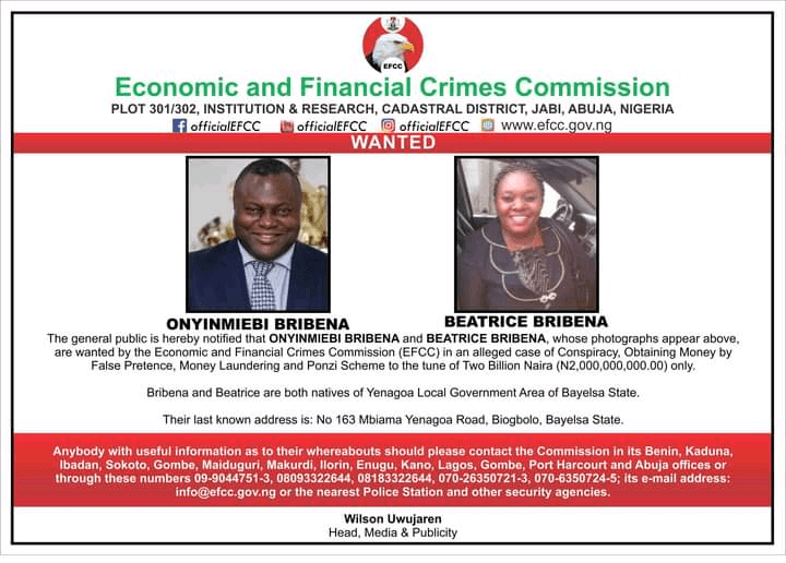 Chief Executive Officer of Baraza Multipurpose Cooperative, a Bayelsa-based ponzi scheme, Pastor (Dr) Miebi Bribena (full name: Onyimiebi Bribena) and his wife, Beatrice Bribena were declared wanted for allegedly defrauding Nigerians to the tune of N2 billion.
