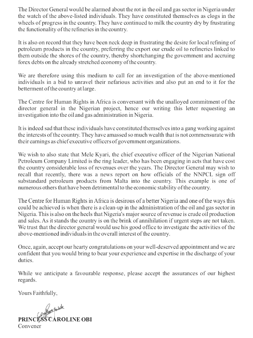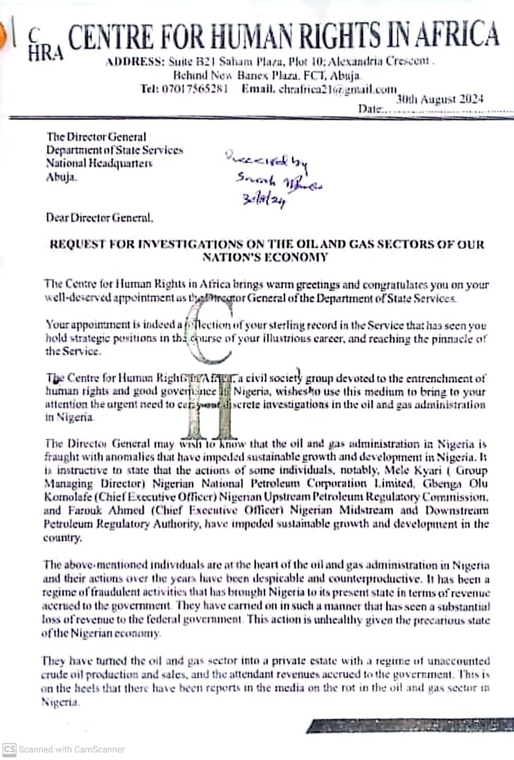 A rights group, Centre for Human Rights in Africa, has written to the new Director-General of the Department of State Services (DSS), Adeola Ajayi, calling for an investigation into the activities of Mele Kyari, Group Managing Director of the Nigerian National Petroleum Company Limited (NNPC), and other top officials in the oil sector.