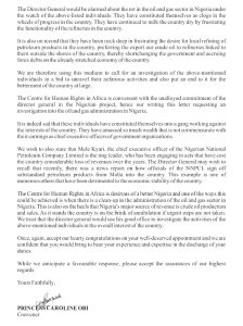 The Centre for Human Rights in Africa is conversant with the unalloyed commitment of the director general in the Nigerian project, hence our writing this letter requesting an investigation into the oil and gas administration in Nigeria.