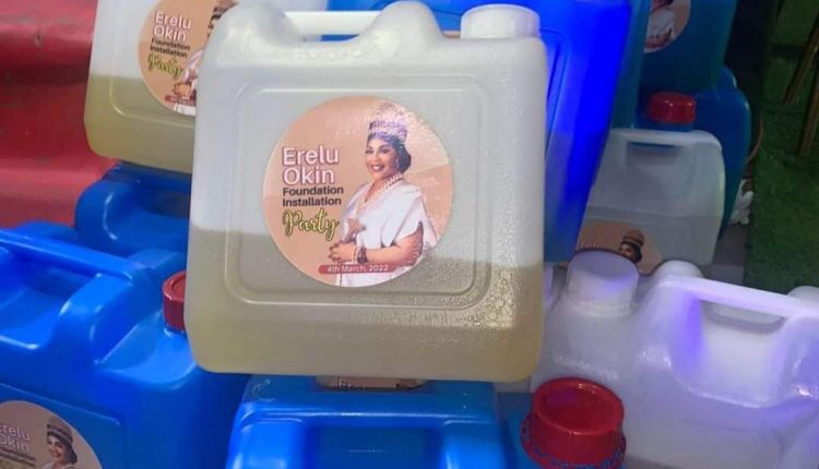The kegs of petrol were seen handed to guests at the party to celebrate Ogbu’s installation as Erelu Okin of Orile Kemta at the Havillah Event Place, Oniru in Lagos.