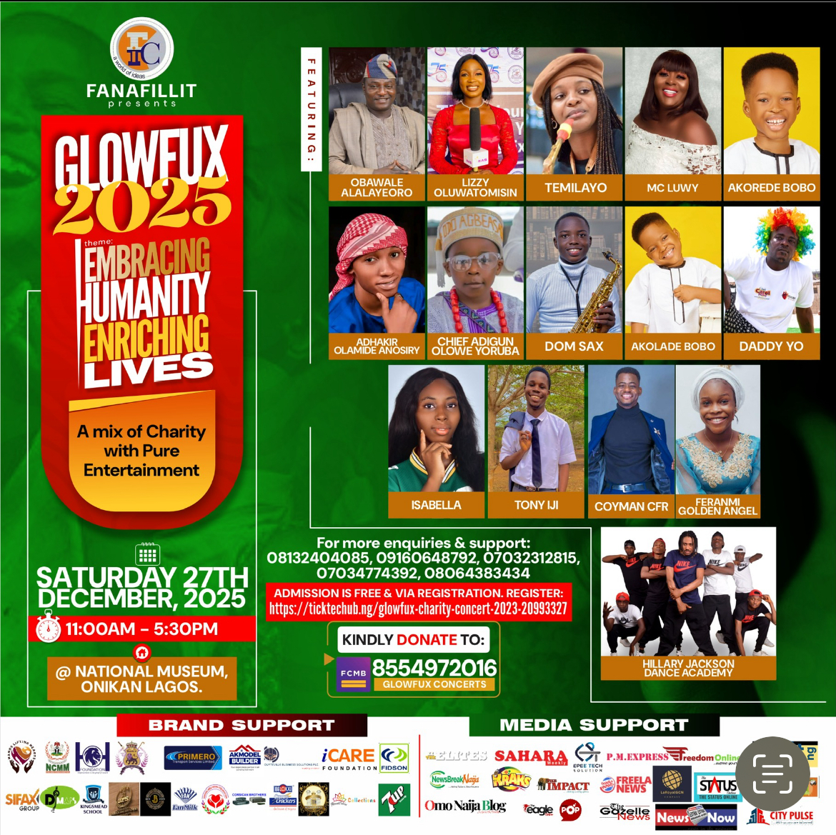The 2025 edition of the GLOWFUX Charity Concert will take place on Saturday, December 27, 2025, at the National Museum, Onikan, Lagos, bringing together prominent figures, emerging talents, and humanitarian champions under the theme “Embracing Humanity, Enriching Lives.”