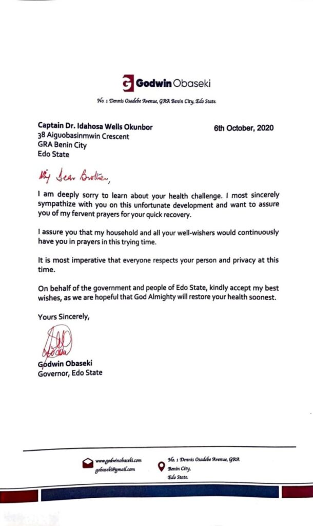 Governor Godwin Obaseki of Edo State has written a letter wishing Captain Hosa Okunbo speedy recovery as he recuperates from an undisclosed ailment overseas.