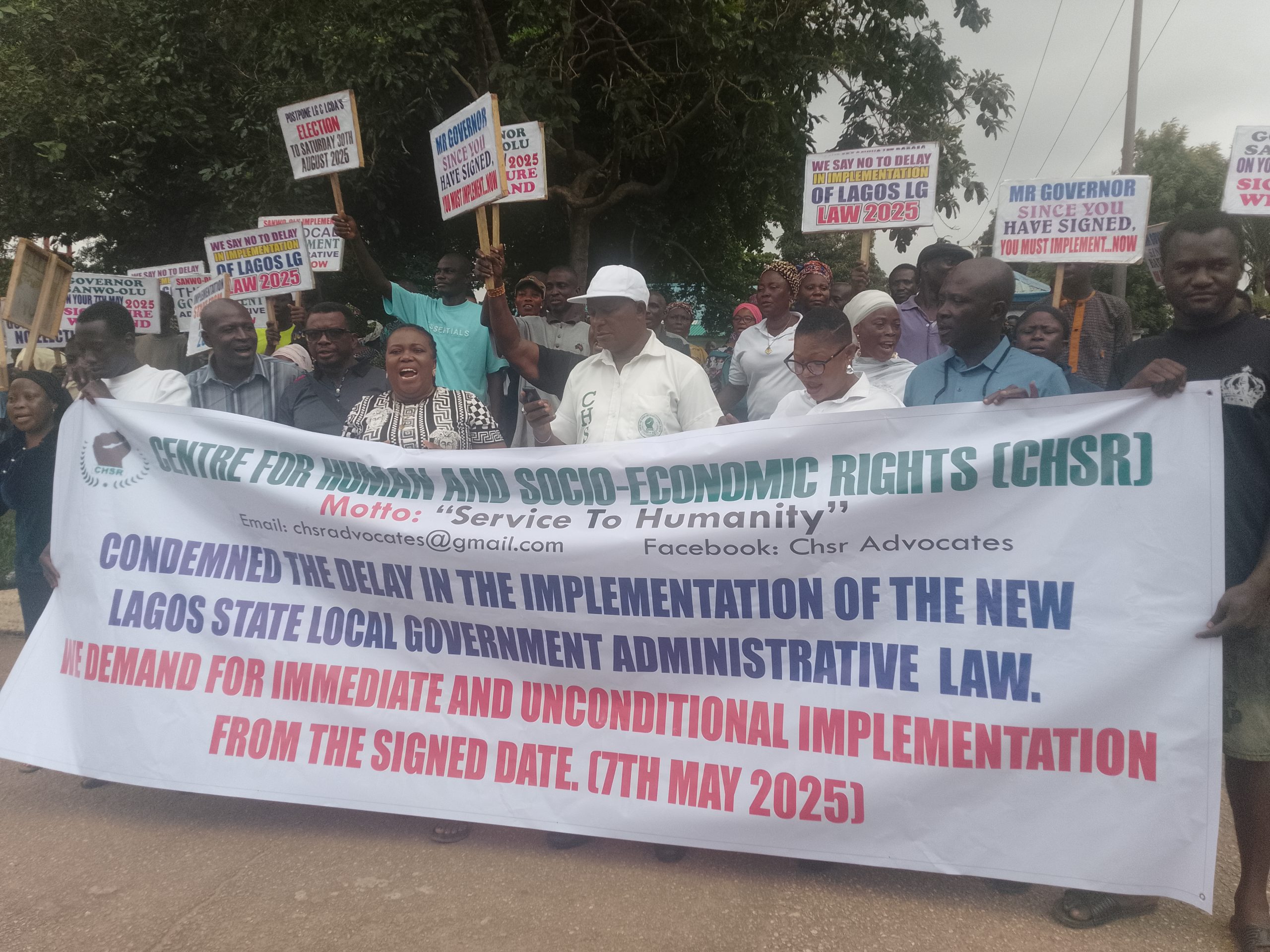 The Centre for Human and Socio-Economic Rights (CHSR) on Tuesday staged a peaceful protest to the Lagos State House of Assembly to express its deep concern and unequivocal opposition to the delay in the implementation of the Lagos State Local Government Administrative Law signed by Governor Babajide Sanwo-Olu, on May 7, 2025.
