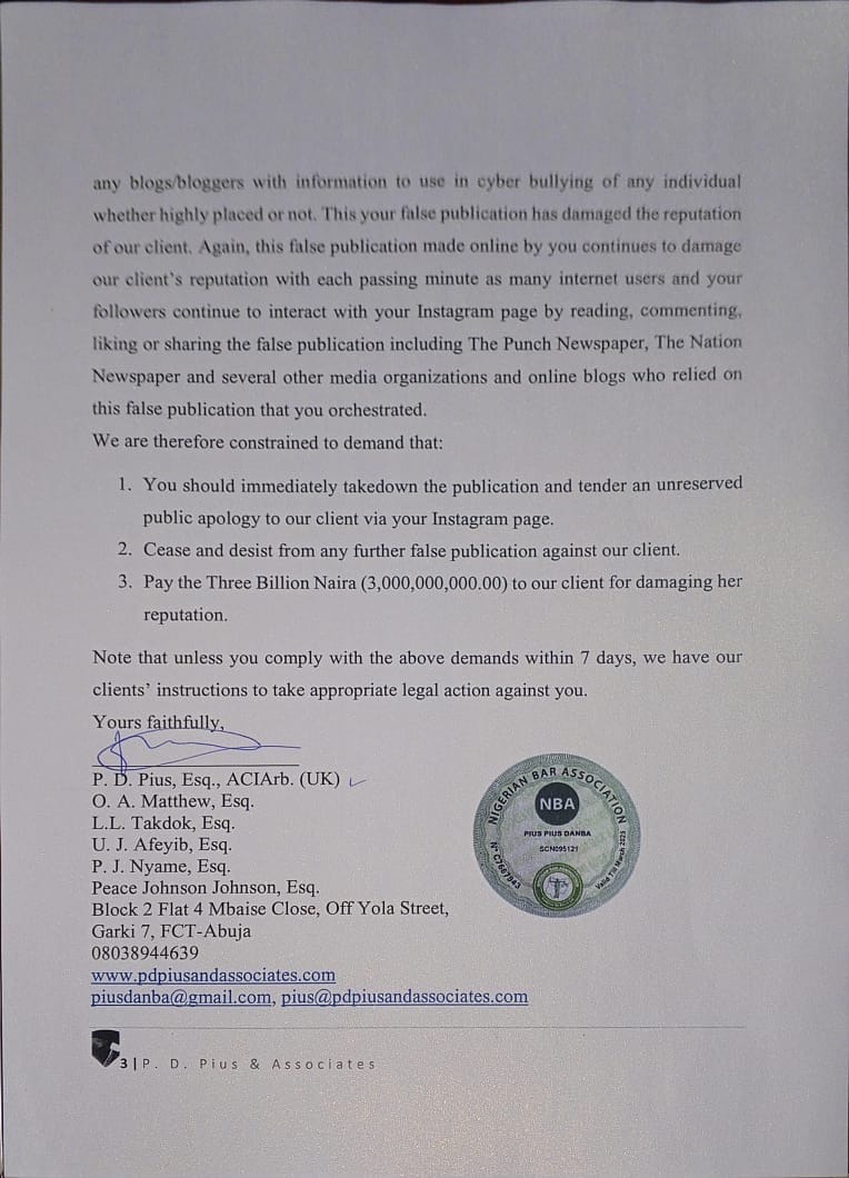 The demand letter includes a stern request for Rollas to take down the original Instagram post, issue a public apology, and pay a staggering three billion naira (approximately $7.5 million) for the damage to Halima’s reputation.