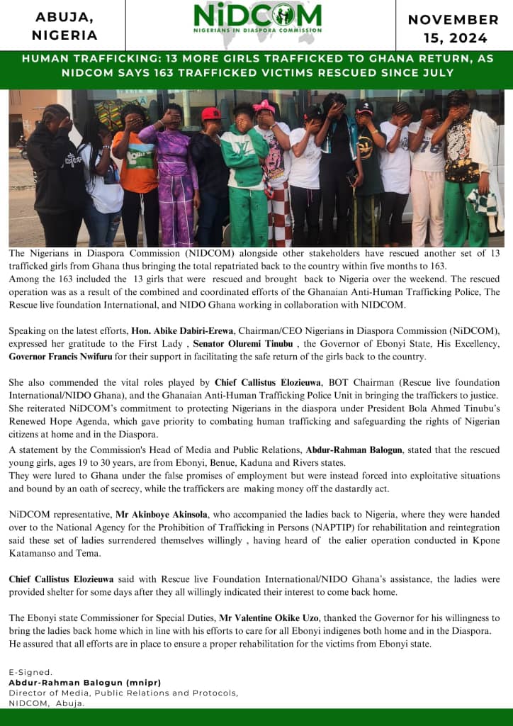 The Nigerians in Diaspora Commission (NIDCOM) alongside other stakeholders have rescued another set of 13 trafficked girls from Ghana thus bringing the total repatriated back to the country within five months to 163.