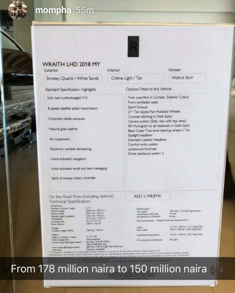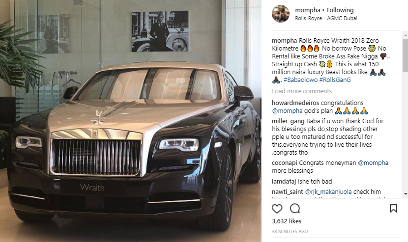 ”Rolls Royce Wraith 2018 Zero Kilometre ??? No borrow Pose ? No Rental like Some Broke Ass Fake Nigga ??.. Straight up Cash ?? This is what 150 million naira luxury Beast looks like ??????. #Babaolowo #RollsGanG”