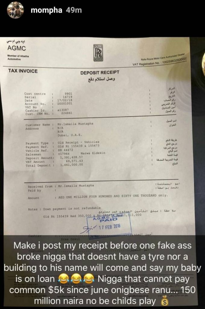 He shared videos of himself paying N150 million in foreign currency for the luxury car in Dubai where he is based. He also showed receipt of the car as he threw shade at Hushpuppi. Mompha says this is his own Rolls Royce unlike some broke ass who rent the luxury cars.