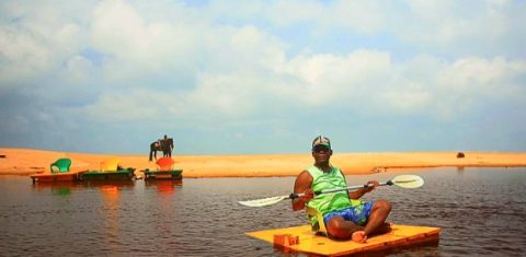 Once again, this item is produced locally from wood and recycled vegetable oil kegs. However, rather than being designed as a floating bed, it incorporates the seating portion of a plastic chair (what’s left after you cut off the chair’s legs) to create an apparatus that will enable tourists gently float on water while relaxing in a seated position.