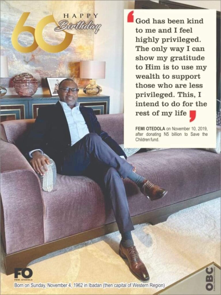Peter Olufemi Otedola—whose 60th birthday today (Friday, November 4, 2022) is the subject of prayers, praises and panegyrics—restores confidence. He amplifies ambition and reminds you that the Almighty ‘dispenses’ fortunes (Oluwanisola). The colourful Ibadan, Oyo State-born entrepreneur (from Odoragunsin, near Epe, Lagos State) readily affirms the intervention of God in destinies.
