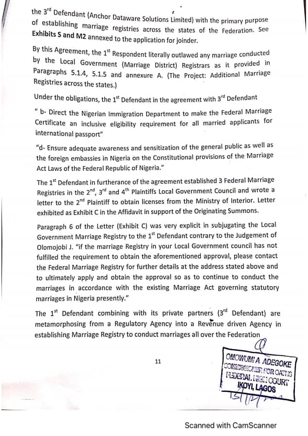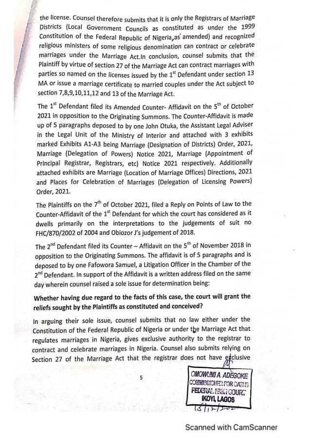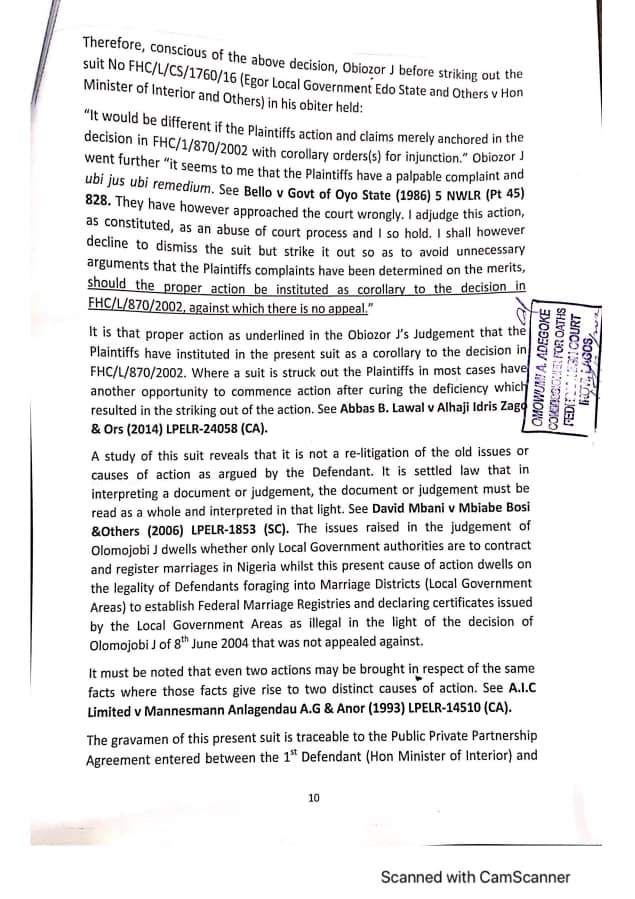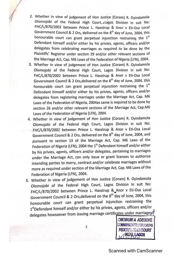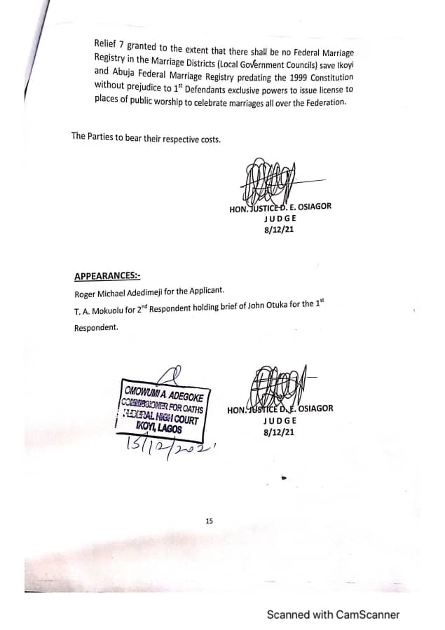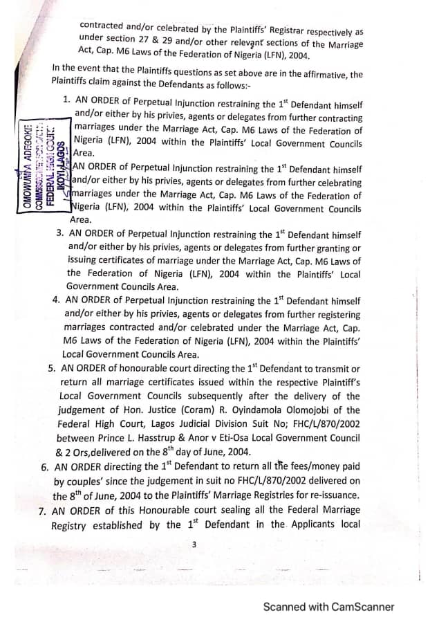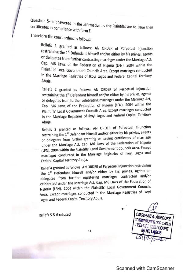 “Reliefs 3 granted as follows: AN ORDER of Perpetual Injunction restraining the 1st Defendant himself and/or either by his privies, agents or delegates from further granting or issuing certificates of marriage under the Marriage Act, Cap. M6 Laws of the Federation of Nigeria (LFN), 2004 within the Plaintiffs’ Local Government Councils Area. Except marriages conducted in the Marriage Registries of Ikoyi Lagos and Federal Capital Territory Abuja.