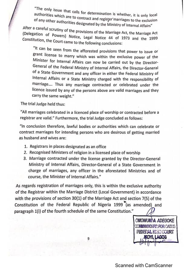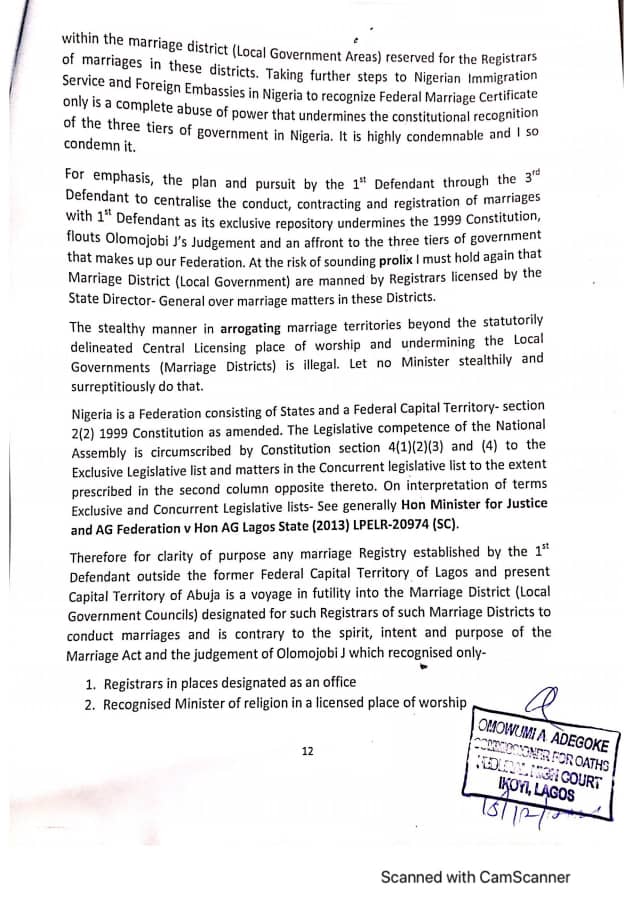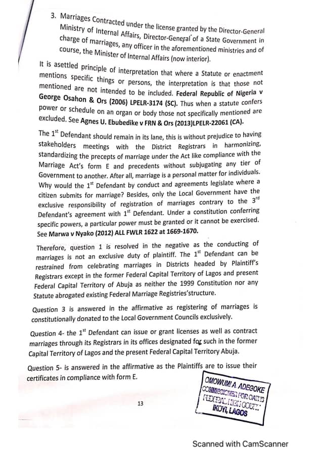 He granted the prayer to the extent that there shall be no Federal Marriage Registry in the Marriage Districts (Local Government Councils) save Ikoyi and Abuja Federal Marriage Registry which predate the 1999 Constitution.