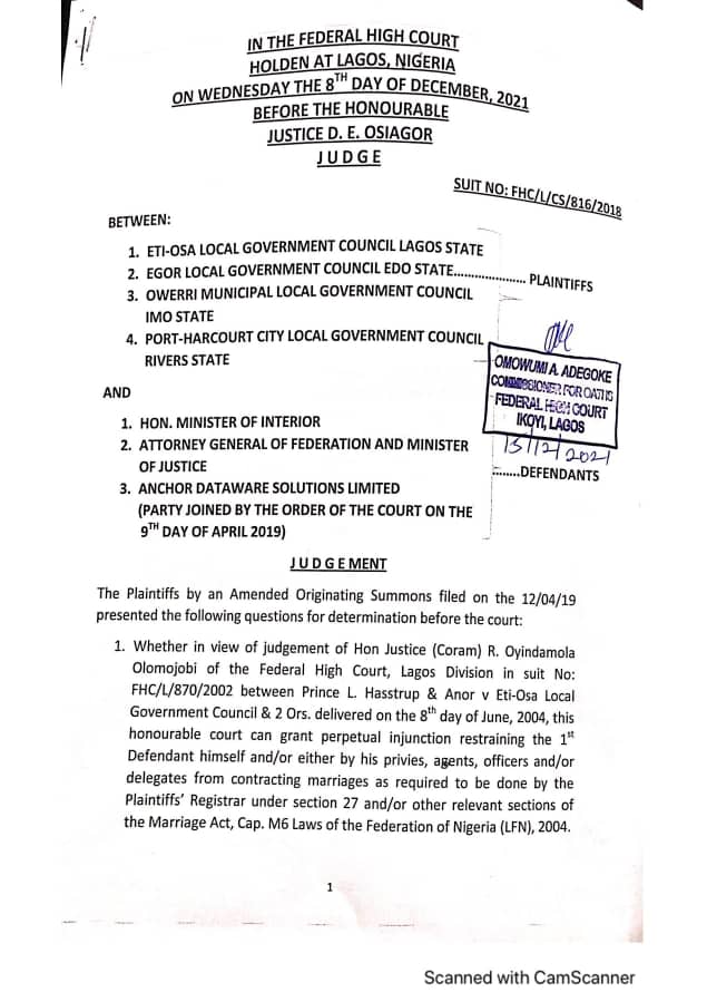 Justice Osiagor, however, refused to direct the Minister of Interior to return all marriage certificates issued within the respective Plaintiffs’ Local Government Councils since June 8, 2004, as demanded by the plaintiffs.