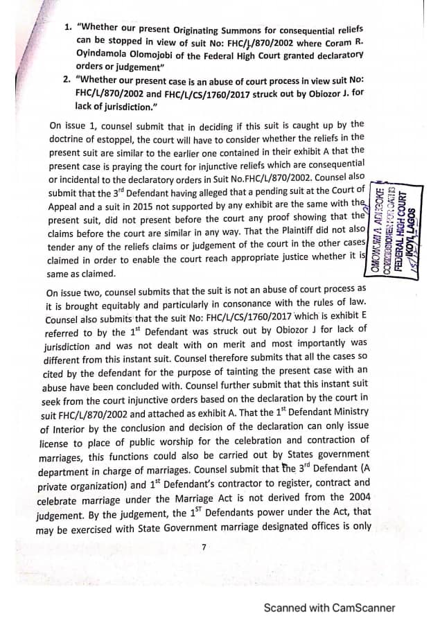 “Relief 7 granted to the extent that there shall be no Federal Marriage Registry in the Marriage Districts (Local Government Councils) save Ikoyi and Abuja Federal Marriage Registry predating the 1999 Constitution without prejudice to 1st Defendants exclusive powers to issue license to places of public worship to celebrate marriages all over the Federation.”