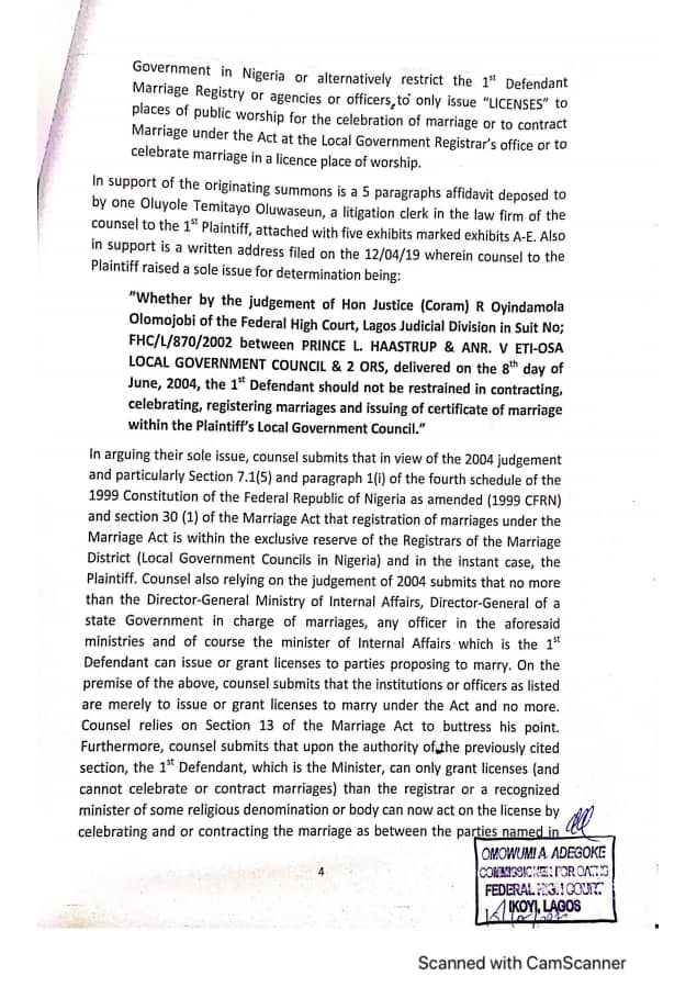 “Relief 4 granted as follows: AN ORDER of Perpetual Injunction restraining the 1st Defendant himself and/or either by his privies, agents or delegates from further registering marriages contracted and/or celebrated under the Marriage Act, Cap. M6 Laws of the Federation of Nigeria (LFN), 2004 within the Plaintiffs’ Local Government Councils Area. Except marriages conducted in the Marriage Registries of Ikoyi Lagos and Federal Capital Territory Abuja.