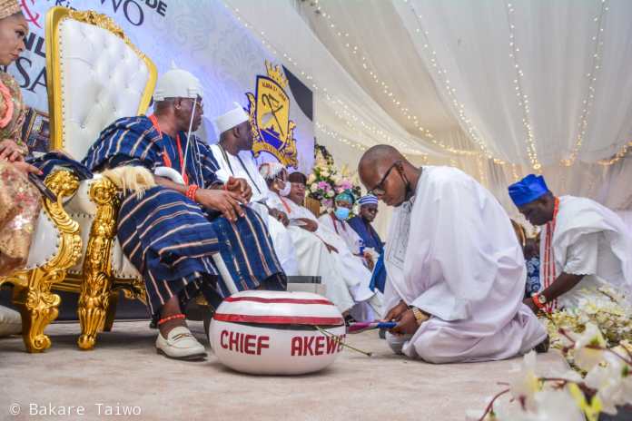 When Folarin Coker stepped into the podium with his wife, the traditional ceremony began immediately with Alara extolling the virtues of Folarin Coker as a true son of Oodua and a man of the people, who makes sure that everything is done in order wherever he is.