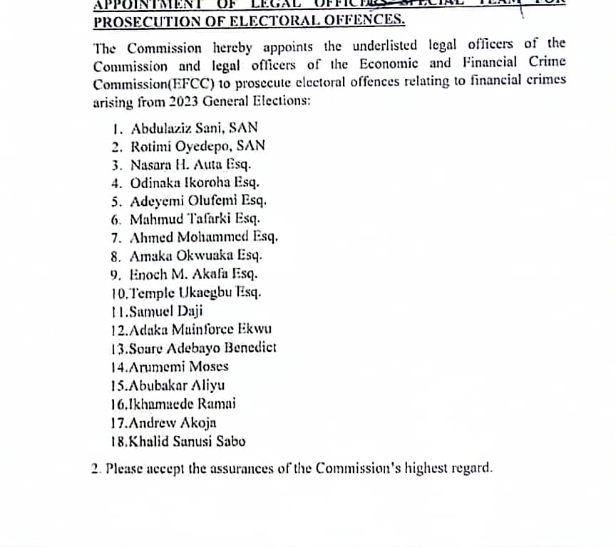 The Independent National Electoral Commission and the Economic and Financial Crime Commission (EFCC) have appointed 18 lawyers including two Senior Advocates of Nigeria (SANs) to prosecute electoral offenders.