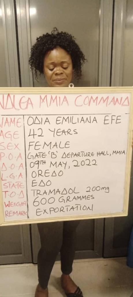 At the Lagos airport, a female passenger, Odia Emiliana Efe was arrested on Monday 9th May why trying to board Royal Air Moroc flight from Lagos via Casablanca to Milan, Italy with 1000 tablets of Tramadol 200mg concealed in food items.