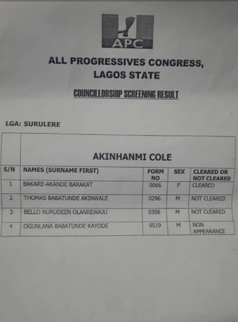 This medium is in receipt of a list of disqualified aspirants from ‘Ward E’ in Surulere LG. They are Thomas Babatunde Akinwande and Bello Nurudeen Olanrenwaju. Another aspirant so excluded is Ogunlana Babatunde Kayode, who reportedly failed to appear before the screening committee.
