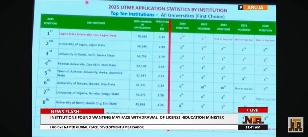 Lagos State University has attained a remarkable milestone, emerging as the most subscribed university in Nigeria for the 2025 admission year, according to the latest Unified Tertiary Matriculation Examination (UTME) Application Statistics by Institution, released by the Joint Admissions and Matriculation Board (JAMB).