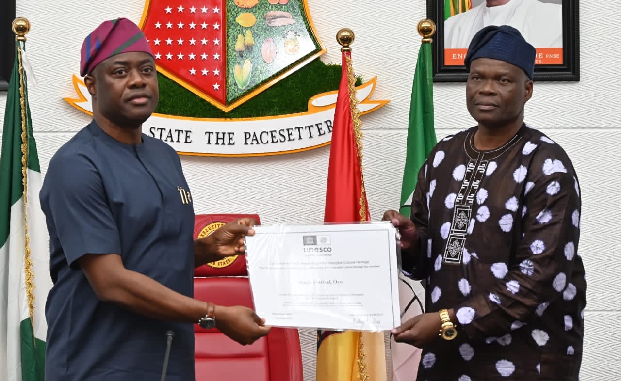 Oyo State governor, ‘Seyi Makinde, has received the UNESCO Intangible Cultural Heritage Certificate for Sango Festival, Oyo.