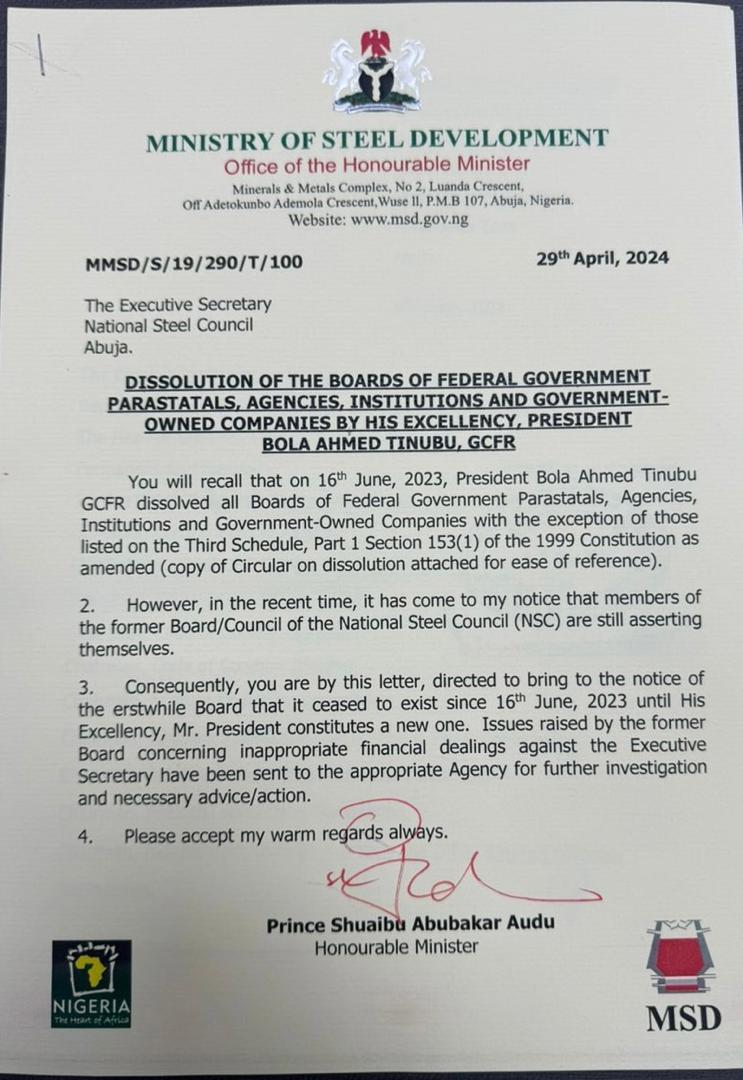 Prince Audu, in a letter addressed to the Executive Secretary of the National Steel Council on April 29, 2024, reiterated the dissolution of the Board in line with the directives of the President, His Excellency Bola Ahmed Tinubu GCFR, which was issued through the office of the Secretary to the Government of the Federation (SGF) with circular ref. No. SGF.19/S.81/XX/10 on 16 June 2023.