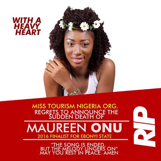 20 year old Maureen Onu, a contestant in the 2016 Miss Tourism Nigeria pageant which is billed to take place on July 9th, has died. Maureen died in the early hours of Thursday June 16th after a brief illness. So sad! May her soul rest in peace, amen…
