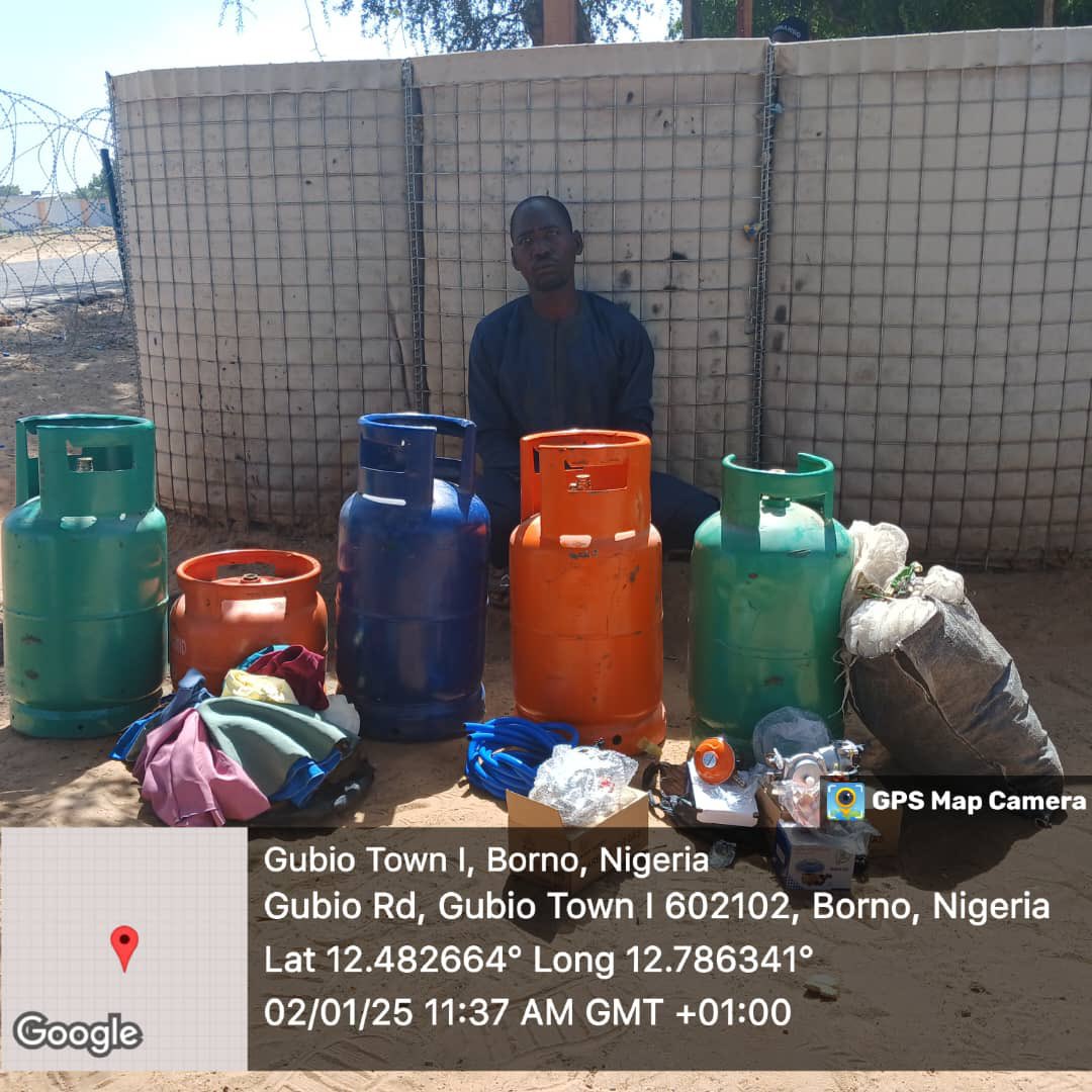 The arrested suspect, identified as Mr Murktar Alhaji Chari (28), confessed to transporting the materials to Damasak town in Mobbar Local Government Area for a planned attack on MNJTF troops. The intercepted materials included four empty 12kg cylinders, one empty 6kg cylinder, two carburettor gas canisters, two pressure regulators and a hose.
