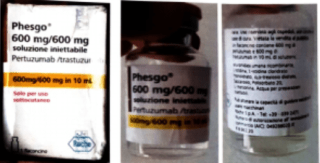 “The Marketing Authorization Holder (MAH) Roche received a complaint from a doctor at Lagos University Teaching Hospital (LUTH-NSIA) reporting a suspected counterfeit Phesgo® 600mg/600mg, labelled with batch C5290S20. The product was reported to have been brought in by a patient for administration. It had not been administered at the time of the report, as it matched the previously reported counterfeit batch C3809C51.