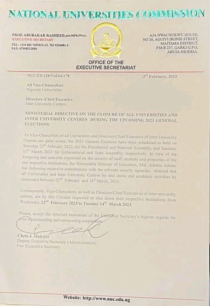 In the letter, which was addressed to all the Vice Chancellors of the Nigerian Universities, the NUC noted that “as Vice-Chancellors of all Universities and Directors/Chief Executive of Inter-University Centres are quite aware, the 2023 General Elections have been scheduled to hold on Saturday 25th February, 2023, for the Presidential and National Assembly and Saturday 11th March, 2023 for Gubernatorial and State Assembly, respectively.