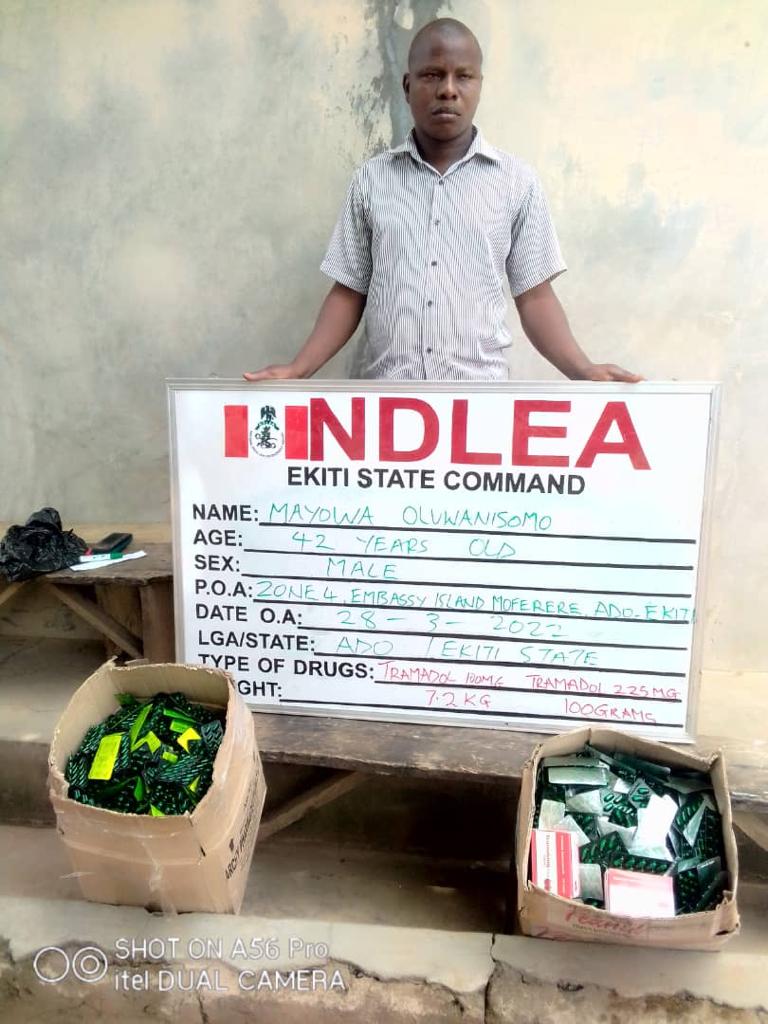 In Ado Ekiti, narcotic officers on Monday 28th March also arrested a 42-year-old lawyer, Mr. Mayowa Oluwanisomo, in Zone 4, Embassy Island, Moferere area of the Ekiti state capital following credible intelligence that he deals in psychotropic substances. A total of 11, 570 tablets of Tramadol weighing 7.3kilograms were recovered from him when his residence was searched. He admitted ownership of the drug exhibits, adding that he graduated from Ekiti State University, Ado Ekiti and Abuja campus of the Nigerian Law School in 2016.