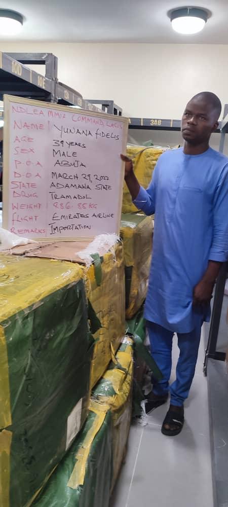 The Lagos airport drug syndicate was behind the smuggling of 1, 584,000 tablets of Tramadol seized on Tuesday 15th March by NDLEA operatives in collaboration with Aviation Security (AVSEC) and Customs service personnel at the airport. The seizure includes 17 cartons of 250mg Tramadol branded as “Tamra” weighing 669.70kg and five cartons of 225mg Tramadol under the brand name “Royal” with a gross weight of 217.15kg.