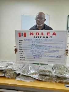 In Lagos, operatives of a special operations unit of the Agency on Tuesday 14th January raided the hideout of a 59-year-old Nwokedi Emeka Jonas in Ojodu-Berger area of the state where they recovered 10 parcels of Canadian Loud, a synthetic strain of cannabis weighing 4.9kg as well as different paper bags he uses in dispensing the psychoactive substance in retail quantities. Printed on them include street names and codes such as ‘Dead man’; ‘Gelato top shelf smoke’; ‘Topshelf’; and ‘Gelato cake’