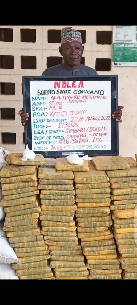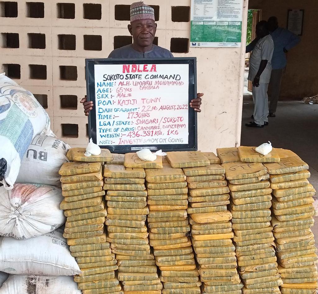 A raid operation at Kara Masaka, back of Mararaba market and Zamani estate on Saturday 27th Aug. led to the arrest of 26 suspects, while 25.7kg cannabis, 4.5kg codeine and 300 tablets of rohypnol tablets were seized from the drug joints raided. In Sokoto state, the village head of Ruga, Shagari LGA, Alhaji Umaru Mohammed (aka Danbala), a notorious drug dealer who was arrested on Monday 22nd Aug. will be facing charges any moment from now. Before his recent arrest during which 436.381kg cannabis and 1kg diazepam were recovered from his house, an earlier raid on his home on July 20th 2022 had also led to the seizure of 11.5kg cannabis, 2.259kg exol5 and 500grams of diazepam.