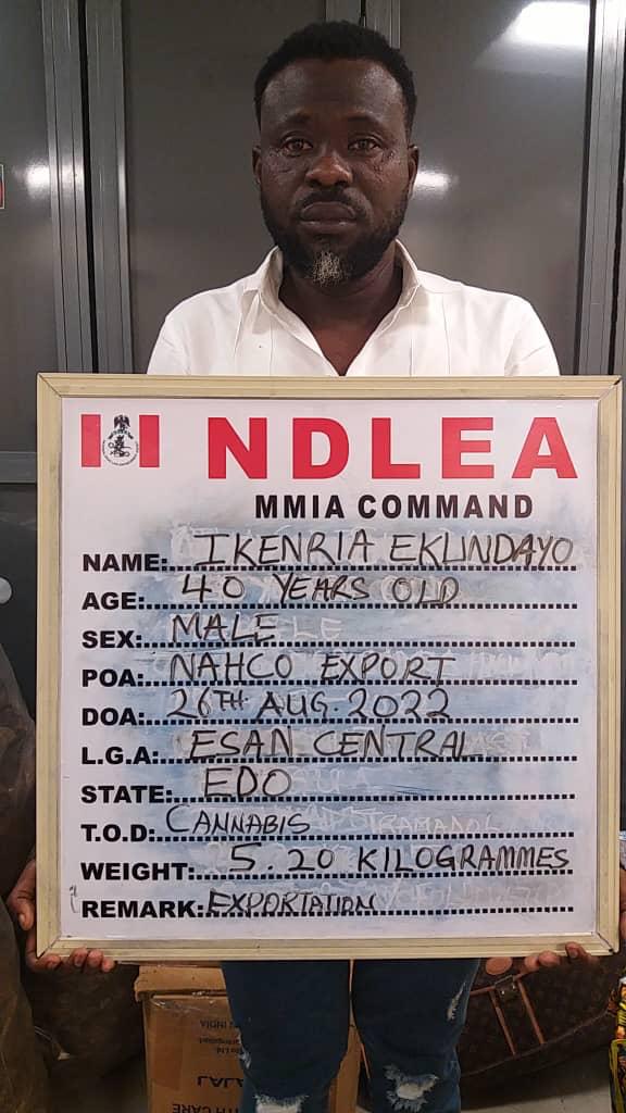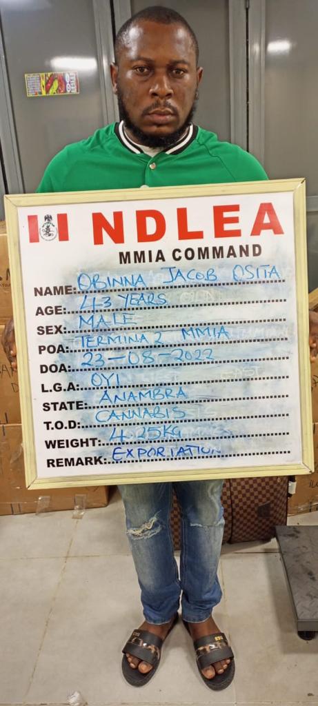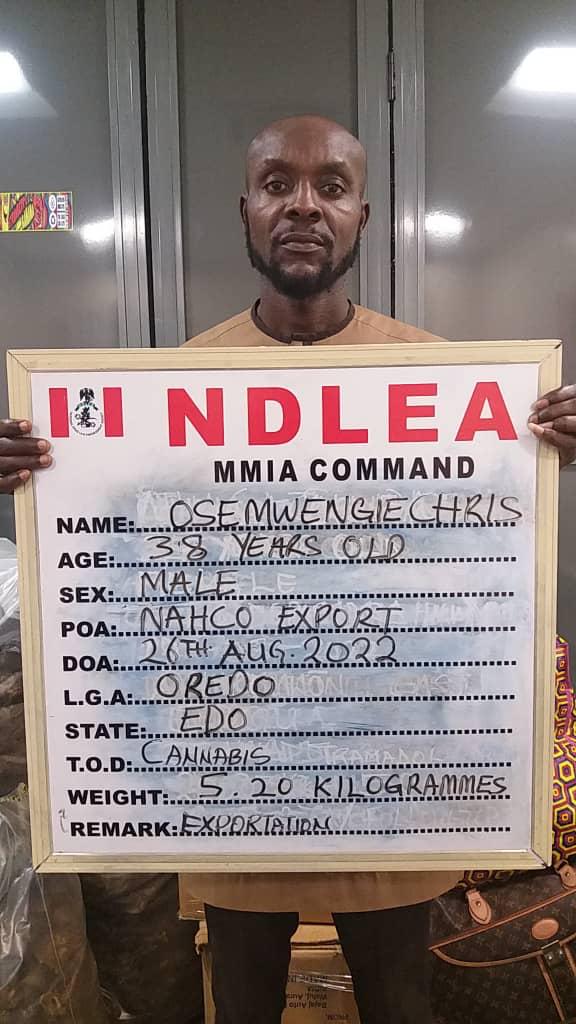 He was nabbed on Tuesday 23rd August following the arrest of an intending passenger on Airpeace flight to Dubai, UAE, Obinna Jacob Osita who was arrested with three bags, two of which contained eight blocks of cannabis sativa weighing 4.25kg concealed in cassava product, gari and crayfish. One other member of the airport syndicate who works with Ohiagu has also been arrested while operatives are after another suspect.