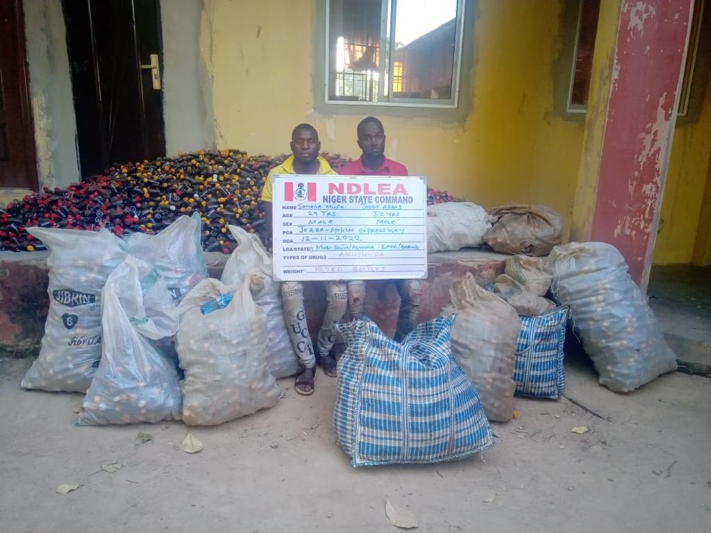 In Niger state, NDLEA operatives on stop and search operation along Mokwa-Jebba road on Saturday 12th Nov. arrested two suspects; Ismail Musa and Jidda Abbas with 10,780 bottles of Akuskura, a new psychoactive substance concealed inside two Toyota Camry saloon cars marked AGL 861 GS Lagos and KMK 118 SC Bayelsa. The consignment loaded in Ibadan, Oyo state, was going to Abuja for distribution.