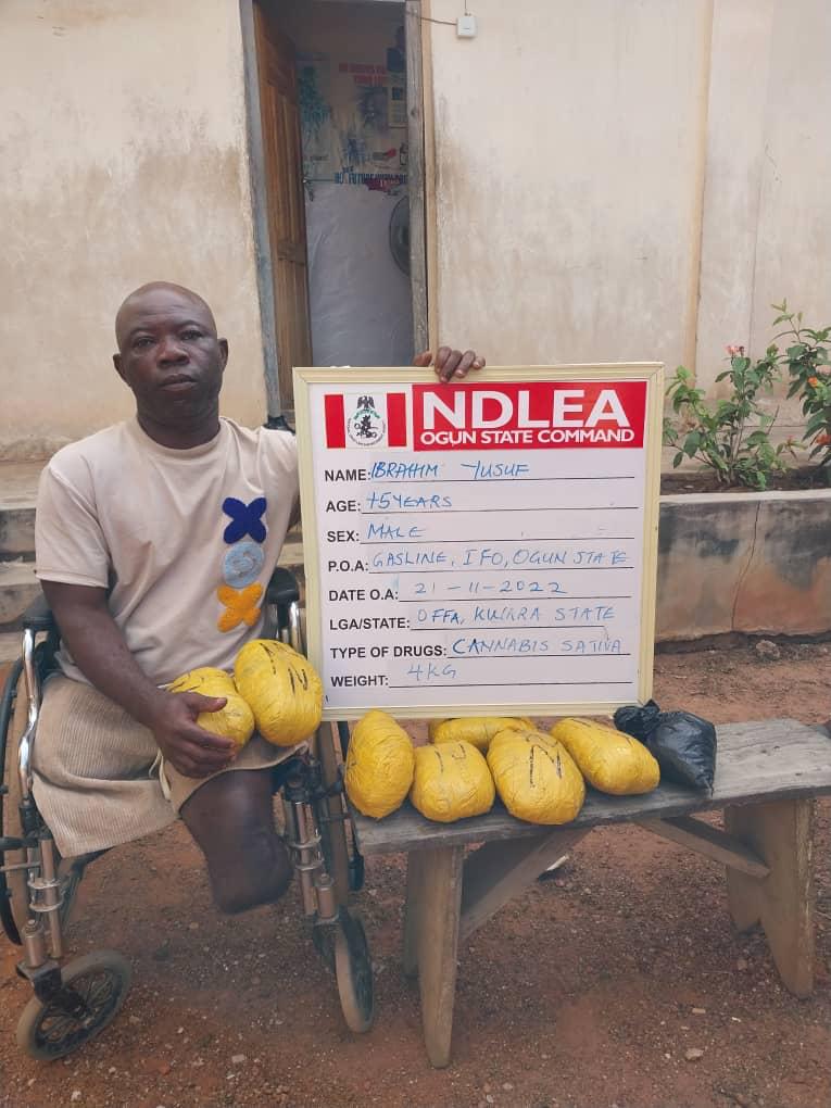 No fewer than 5,851.3 kilograms (5.8 tons) of cannabis sativa were seized from dealers across five states in the past week, including a notorious cripple, Ibrahim Yusuf, 45, who was arrested on Monday 21st Nov. at Gasline, Ifo, Ogun state with 4kg of the psychotropic substance, while a total of 36 bags weighing 570kg of the same substance were recovered in another raid at a forest in Ogunmakin town, Obafemi Owode LGA.