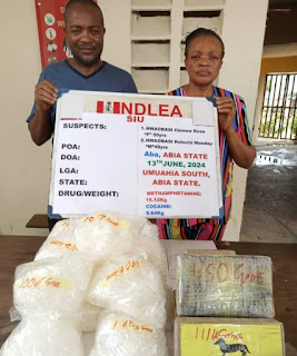 A cartel controlled by a drug baron, 49-year-old Kelechi Monday Nwaobasi and his 50-year-old elder sister, Ms. Chinwe Rose Nwaobasi, has been taken down by officers of the Special Operation Unit of the National Drug Law Enforcement Agency, NDLEA, following the arrest of the siblings and seizure of cocaine and methamphetamine consignments worth over N4.1billion in street value from their hideout in Aba, Abia state.