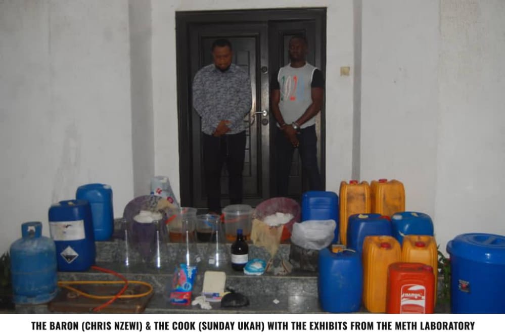“The first one, located in Victoria Garden City (VGC) Estate of Lekki, Lagos, is owned by a baron, Chris Emeka Nzewi, while the second, in Nise Community of Awka South Local Government Area of Anambra State was owned by Paul Ozoemenam. The owners of these two illicit meth laboratories were successfully arrested alongside Sunday Ukah from Aba, Abia State, the cook or chemist that produced the drugs for them.