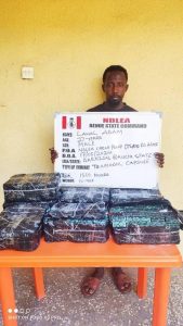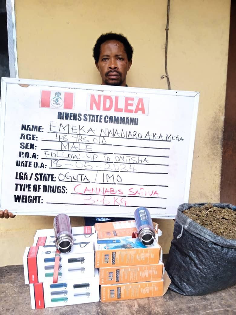 Attempt by Emeka Nwadiaro (a.k.a Mega) to export 3.6kg Loud, a strain of cannabis concealed in 36 water flasks to Dubai, UAE was also thwarted at a logistic company in Port Harcourt, Rivers state on Thursday 16th May while a swift follow up operation led to the arrest of the owner of the consignment, Emeka Nwadiaro in Onitsha, Anambra state same day.