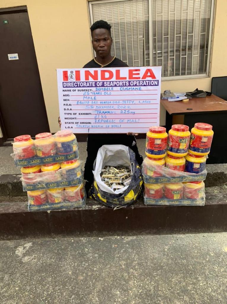 Another raid of the popular Idumota business district of Lagos Island on Saturday 10th December led to the seizure of 35,014 pills of tramadol, diazepam, rohypnol and 21.2 litres of codeine syrup while a targeted notorious dealer is still on the run. This is even as officers of the Directorate of Seaports Operations of the Agency arrested a Malian, Dembele Ousmane on Monday 5th December with 32,400 capsules of tramadol 225mg concealed in factory packed buckets of custard while attempting to travel to Mali via boat at Ebute -Ero Jetty in Lagos.