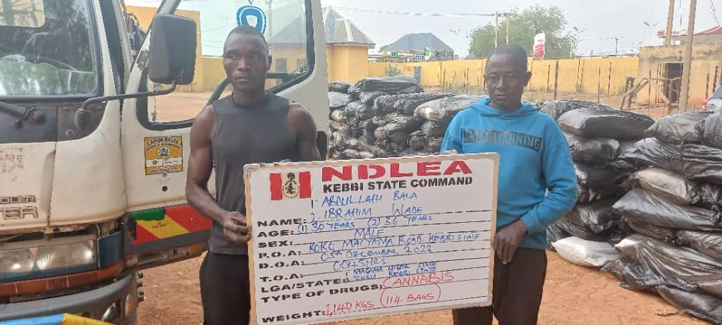 In Kebbi state, two suspects: Austine Julius and Sale Yakubu were arrested on Sunday 4th December along Yawuri-Kebbi road in a loaded Dyna Truck with 117 bags of Cannabis Sativa weighing 1,070 kilograms concealed under bags of oranges. The following day, Monday 5th December, another set of two suspects: Abdullahi Bala and Ibrahim Wade were intercepted along Koko- Kebbi road in a Dyna Truck loaded with 114 bags of the same substance weighing 1,140 kilograms concealed under crates of soft drinks.