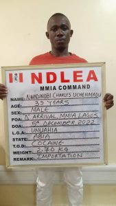 Uchemadu was arrested on Monday 5th December at the Lagos airport during inward clearance of passengers on the Qatar airways flight following the discovery of three parcels of cocaine weighing 2.70 kilograms factory sealed in parts of his travel bag.