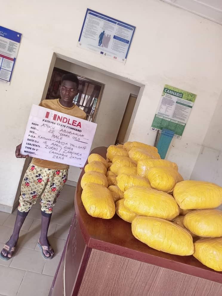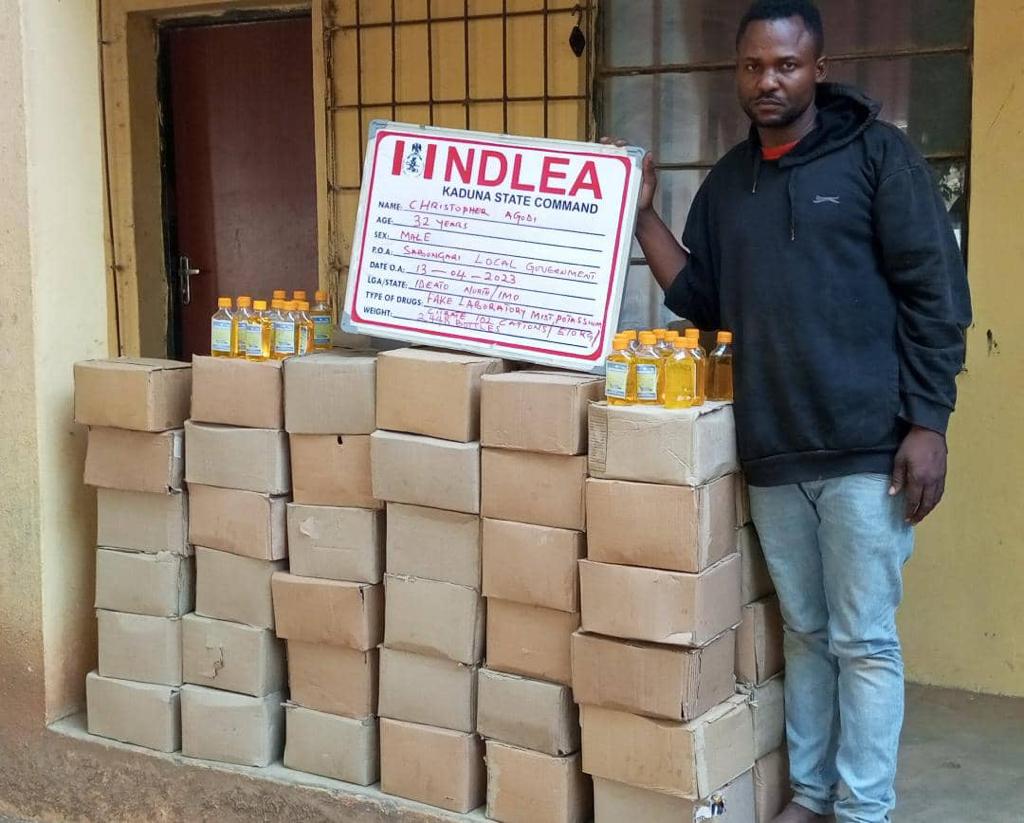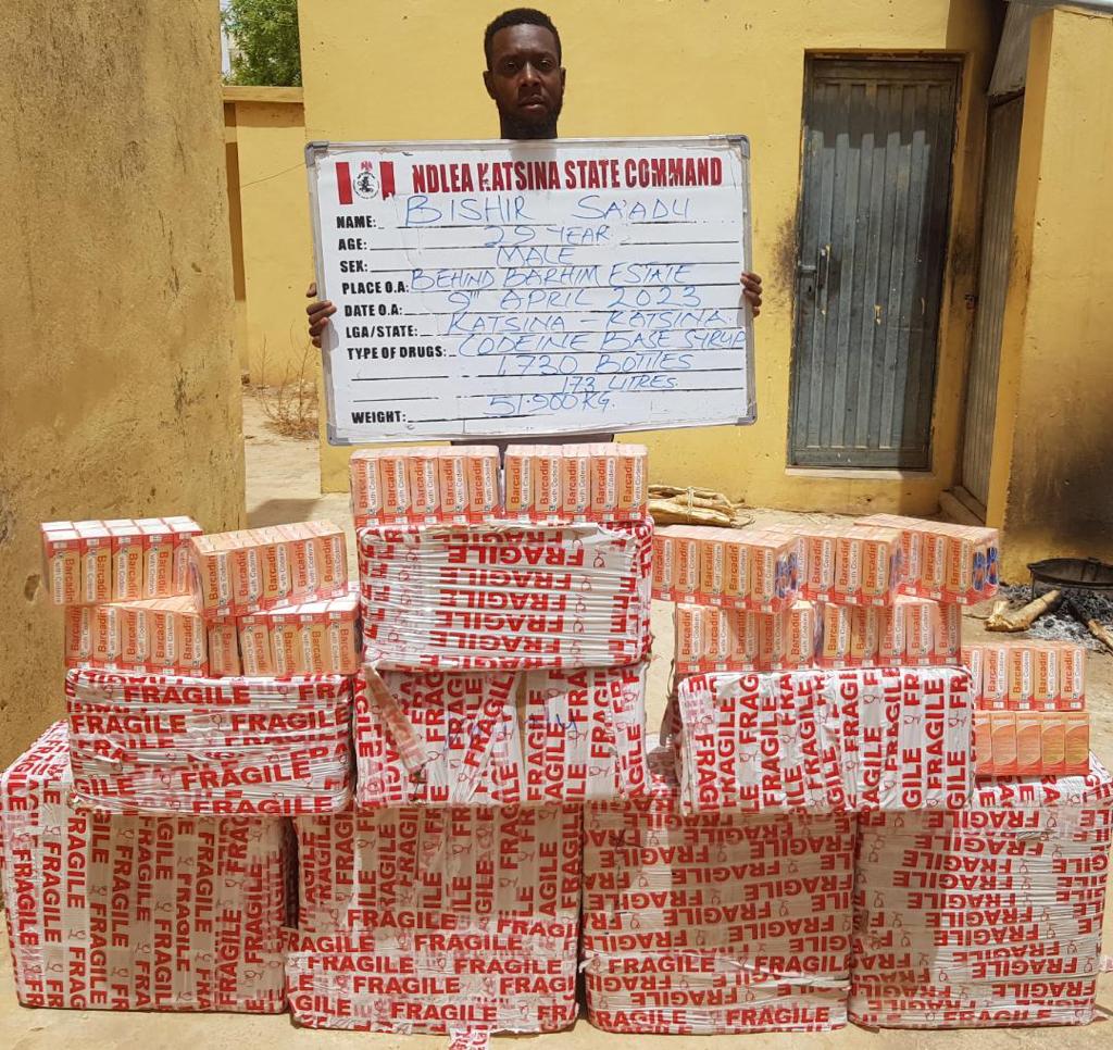 In Katsina state, no less than 1,730 bottles of codeine-based syrup were seized from a suspect, Bishir Saadu in Katsina metropolis on Sunday 9th April just as Muhamadu Yusuf was equally arrested same day with 8,000 capsules of tramadol inside a commercial bus along Kano – Katsina road. In the same vein, NDLEA operatives in Kaduna on Thursday 13th April raided a clandestine laboratory where mist potassium citrate was being produced in a residential apartment at 16 Sabon Gari, Zaria. The owner of the lab, Christopher Agodi was arrested and 102 cartons containing 2,448 bottles of the substance recovered. While a suspect, Salisu Abdullahi, 25, was arrested along Abuja-Kaduna road with 11.7kg cannabis concealed in two jerrycans, which he was moving from Port Harcourt to Kano, operatives also on Saturday 15th April nabbed one Atiku Abubakar, 22, on the same road with 50 blocks of cannabis weighing 28kg while travelling from Lagos to Shinkafi in Zamfara state in a commercial bus.