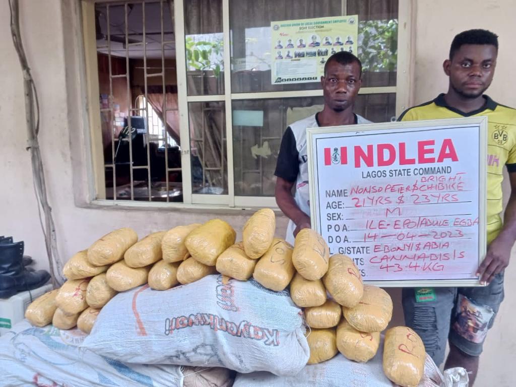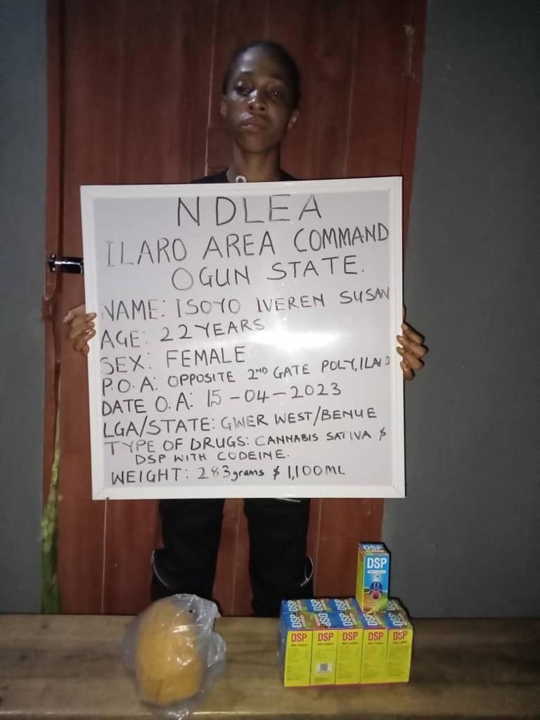 A 22-year-old HND 1 female student of Federal Polytechnic, Ilaro, Ogun state, Isoyo Iveren Susan was on Saturday 15th April arrested opposite 2nd Gate of the institution for dealing in illicit drugs. Recovered from her include 1,100ML of codeine-based cough syrup and 283grams of cannabis. This is just as operatives in Lagos arrested two suspects: Nonso Peter, 21, and Bright Chibike, 23, with 43.4kg cannabis at Ile-Epo, Abule Egba area of the state on Friday 14th April.